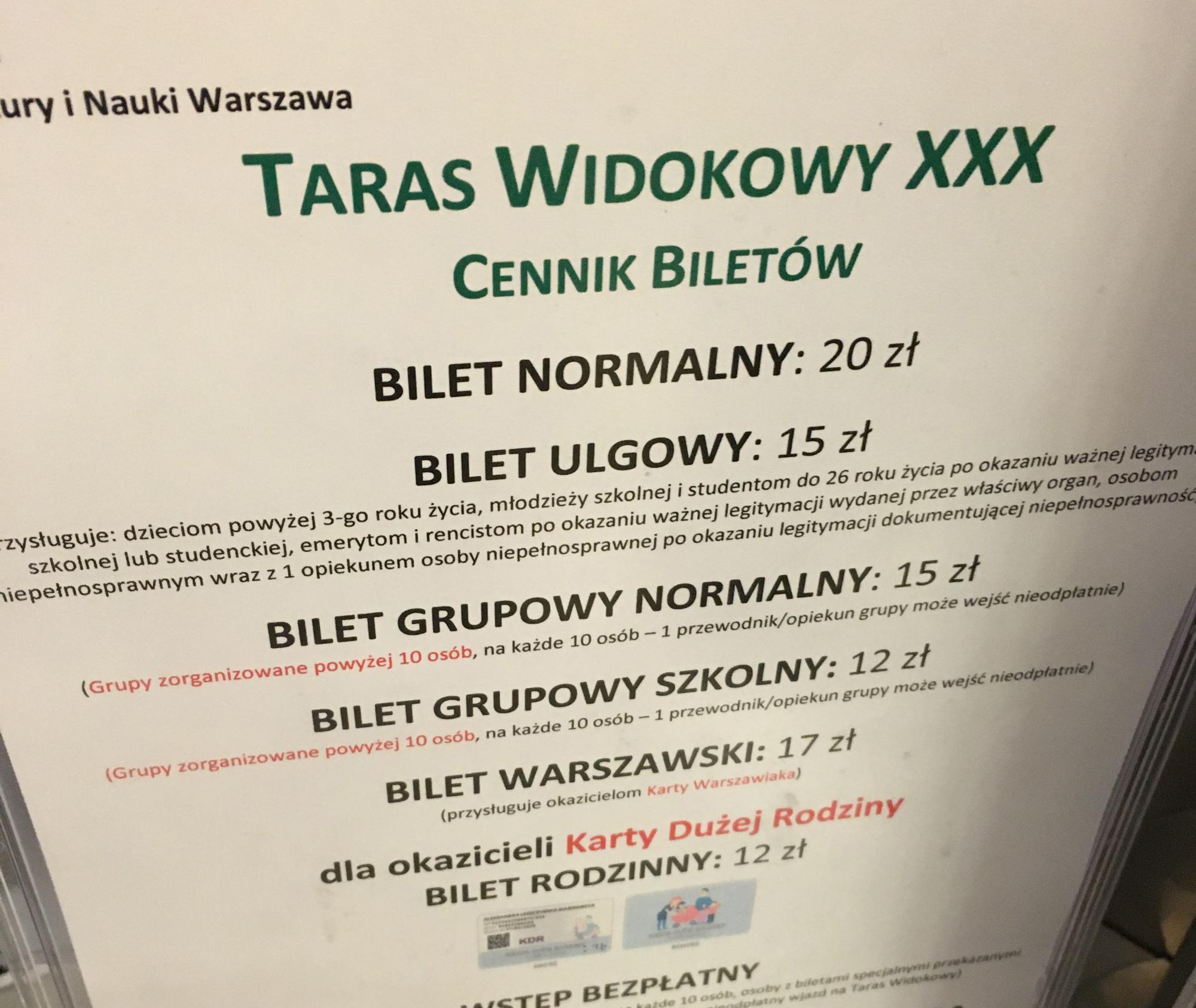 It cost us 20zł each to go to the viewing terrace of the Palace of Culture and Science. Once we bought tickets we popped in an elevator and were quickly on the 30th floor.